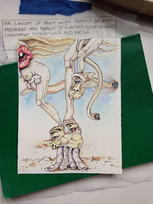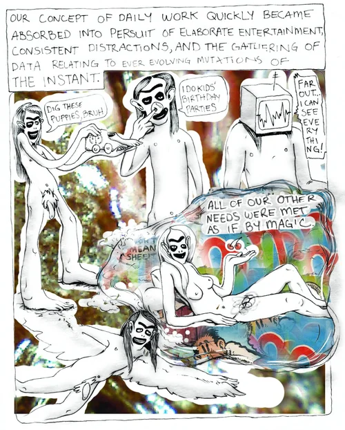 This is a comic I started in 2015. It was put on hold because I didn’t believe in its relevance, but I think a lot of the mechanics and ethos here went into the paintings I’ve been making now, so here’s a peek into the more theatrical part of my process. If you enjoyed this, send me an email, and I’ll pick it back up where I left off, adding everything I’ve learned about the chaos of life as an American Doomerang.